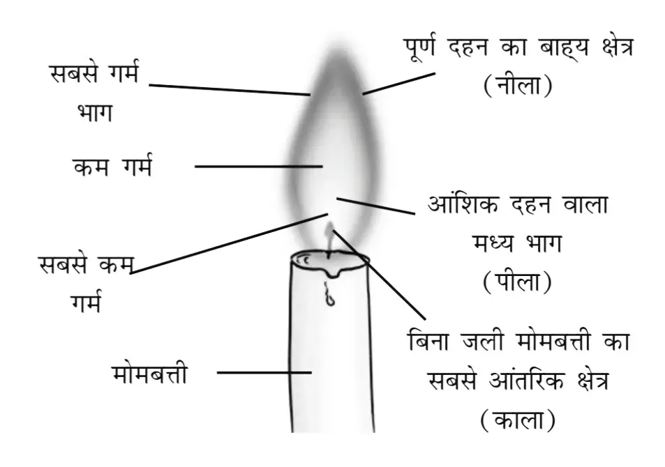 मोमबत्ती की ज्वाला में तीन क्षेत्र होते हैं — बाहरी उज्ज्वल भाग, मध्य भाग और भीतरी गहरा भाग। इन सभी क्षेत्रों में तापमान अलग-अलग होता है।