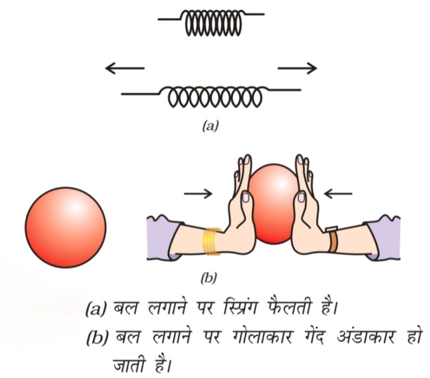 आकार में परिवर्तन स्प्रिंग या रबर को खींचने या दबाने पर उसका आकार बदल जाता है।