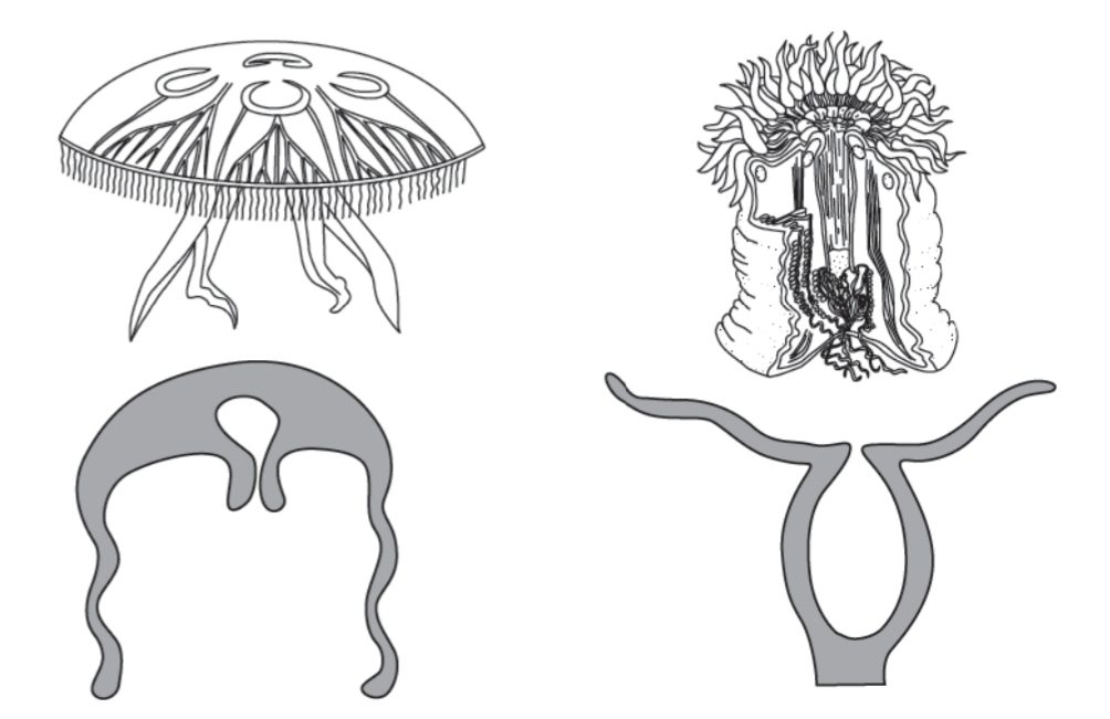 Diploblastic 2 germ layers, no mesoderm, radial symmetry, simple body, examples: Cnidaria