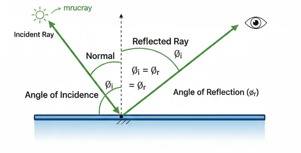 • परावर्तन कोण (Angle of Reflection) — परावर्तित किरण और लंब के बीच का कोण।