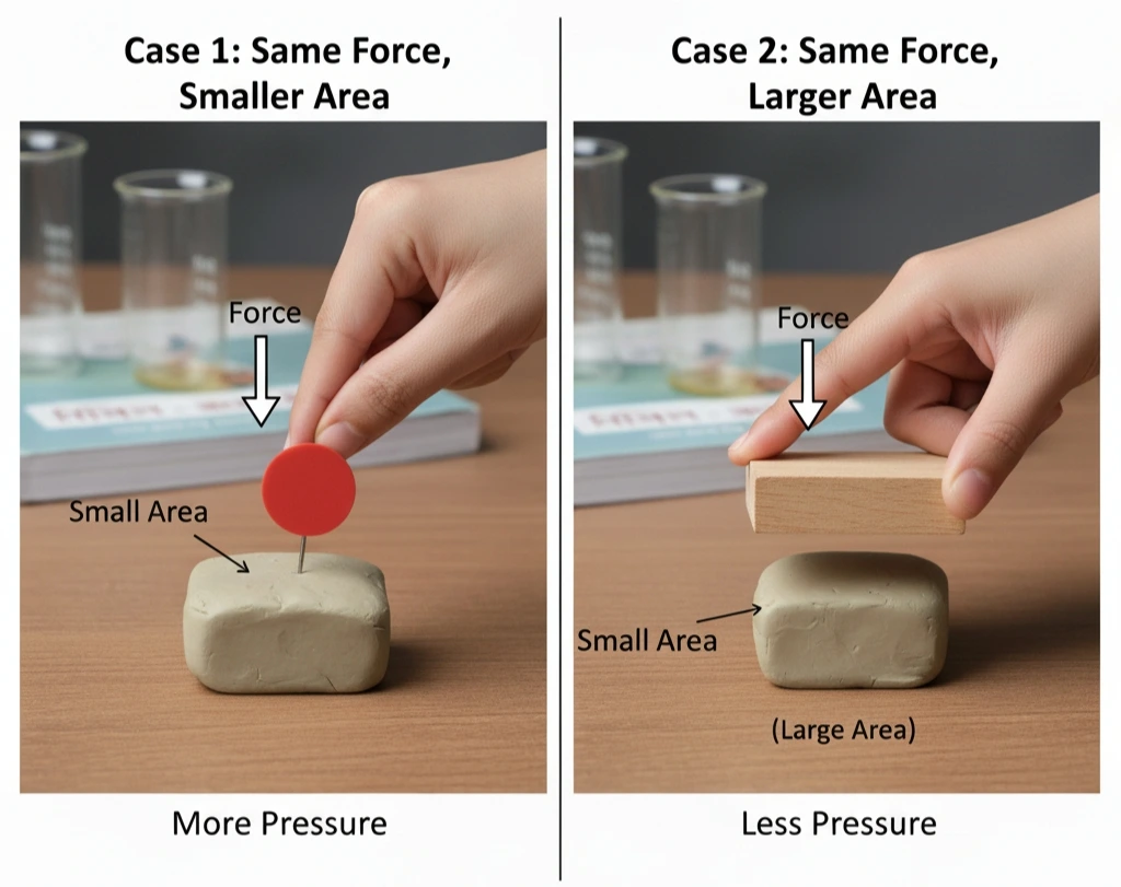 - उदाहरण: बर्फ पर बर्फ के जूते पहनना – दाब कम होने के कारण पैर नहीं धंसते।